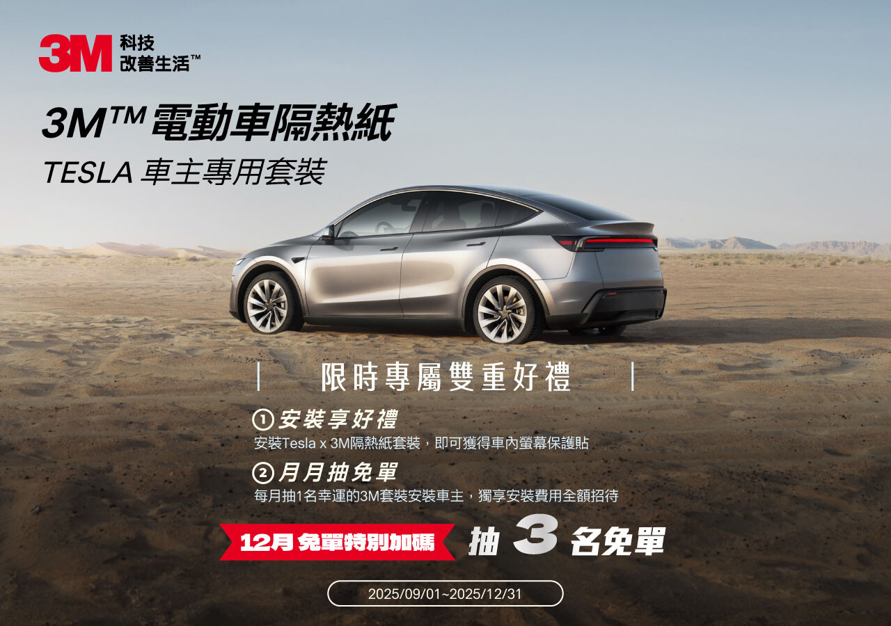 2. 活動辦法:凡於期間內於3M汽車隔熱紙授權店家,安裝3M™ 電動車隔熱紙TESLA車主專用套裝系列,即可獲得限量好禮並參加抽獎!